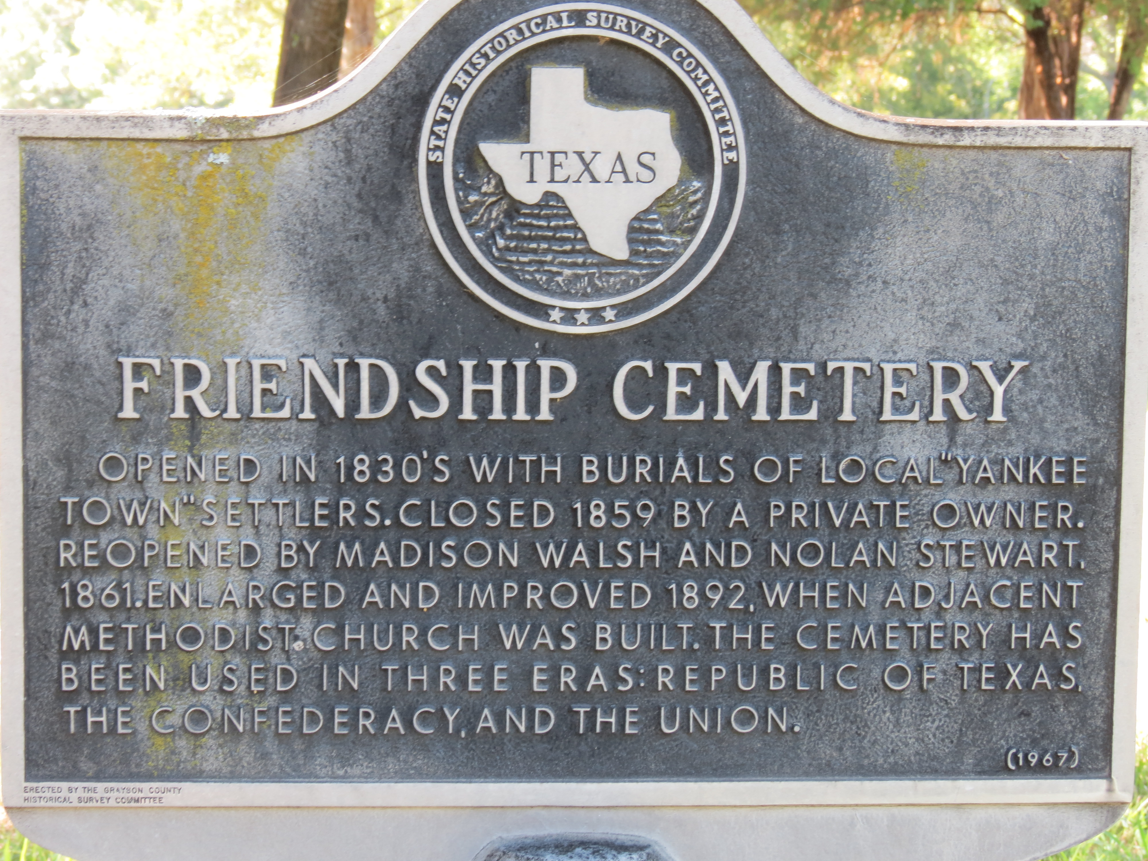 Friendship Cemetery has served three eras: “The Republic of Texas”, “The Confederacy”, and the “Union of the States.” There are people here who served in the “Civil War”, the “Spanish American War”, and World War I and II as well as other wars and conflicts of our time.